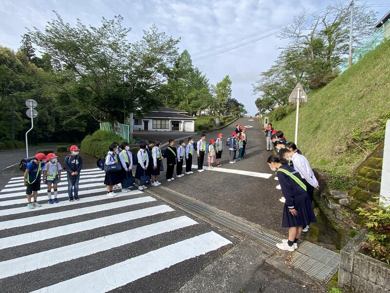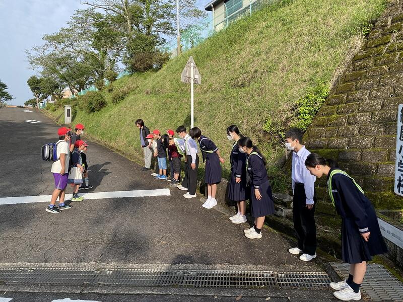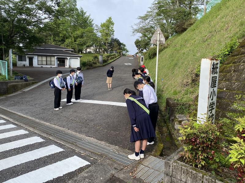 中学校は生徒会執行部が紙屋小前の坂に並んで立ち、登校してくる児童・生徒にあいさつをしました。紙屋のあいさつ運動では、役員だけでなく、登校してくる児童・生徒も並んであいさつするというのが特徴です。