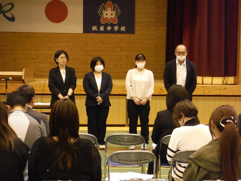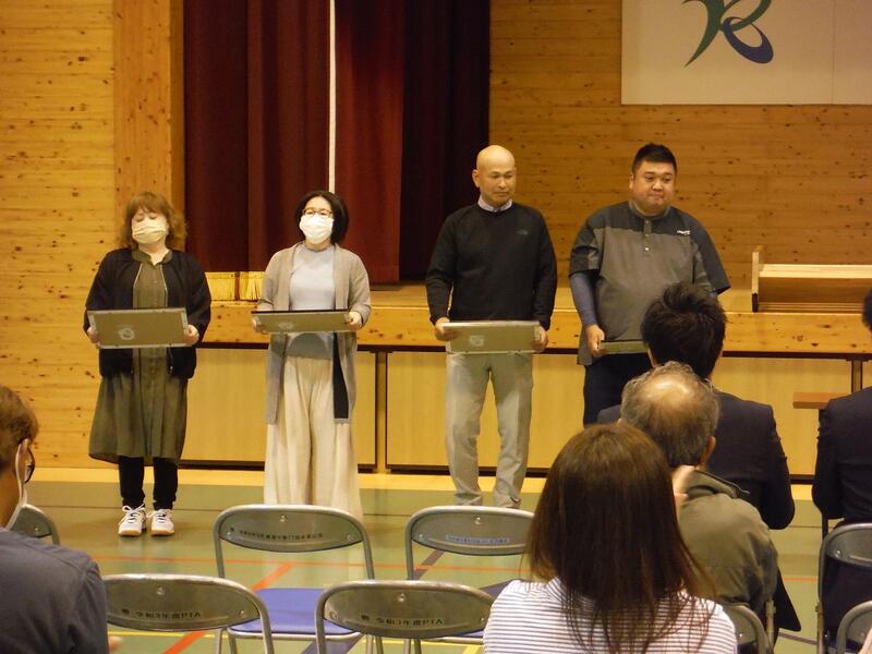 体育館ではPTA総会が行われ、旧役員の方々への感謝状贈呈や、新役員の方々のあいさつもしていただきました。