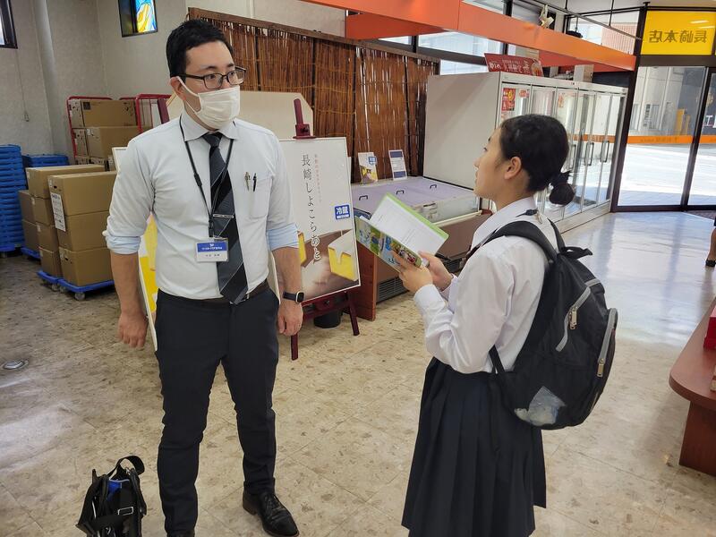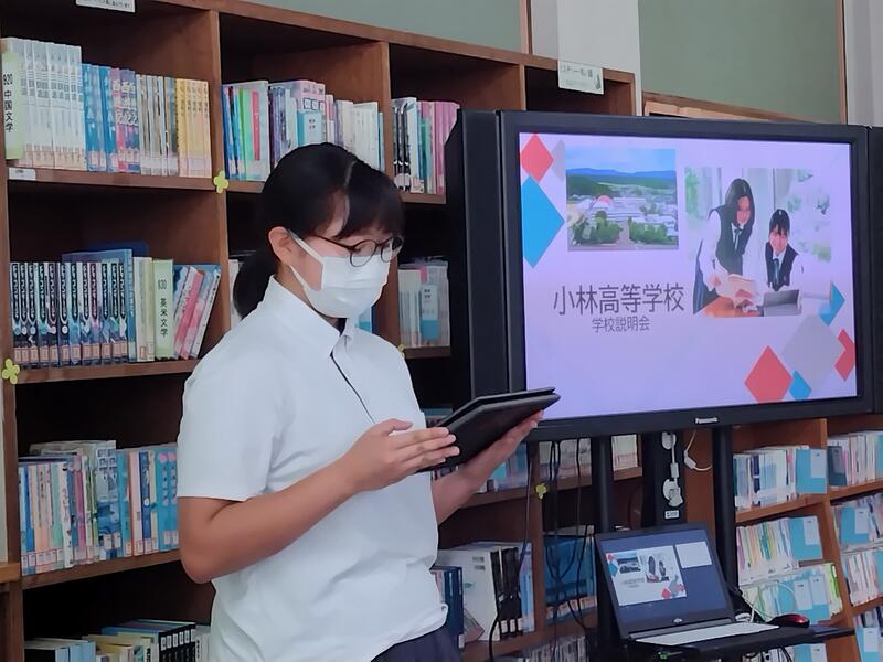 今回は小林高校、宮崎工業高校、宮崎商業高校、鵬翔高校の4校の先生方に説明いただきましたが、小林高校の説明では、本校の卒業生である1年生の家村 琥珀さんが分かりやすく説明してくださり、生徒たちは熱心に話を聞いていました。