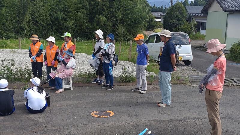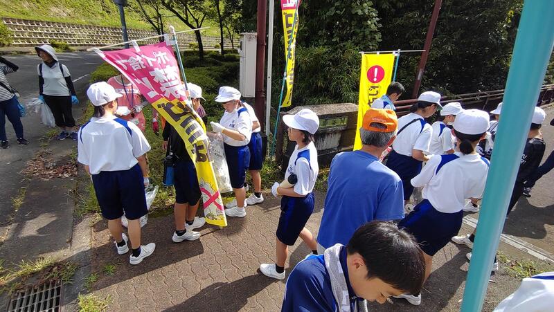 新村地区の花壇までの道すがら、ゴミのポイ捨て防止ののぼり旗を掲げ、ゴミを拾いながら歩きました。花壇に到着して花を植えた後は、市役所の方々も一緒に、拾ったゴミの分別作業を行いました。