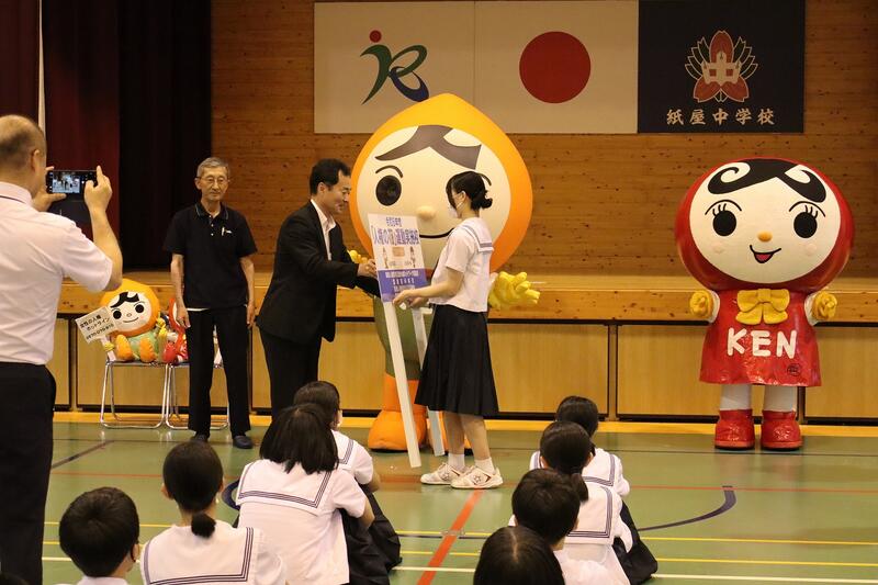 人権のキャラクターである「まもるくん」と「あゆみちゃん」も登場し、生徒たちは思わず笑顔になっていました。