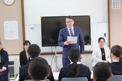 剣道も教えに来てくださった教育委員の永井様から、教育委員会祝辞をいただきました。東京大学名誉教授の甘利俊一先生の「学校へは知識を学びに行くのではなく、人の生き様や人生を学び、仲間との連帯を学ぶために行くものだ」という言葉から、「これからの出会いを礎にし、自分の可能性を広げてください」とメッセージをくださいました。