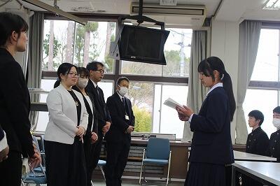 在校生送辞では、生徒会長から「3年生の背中からたくさんのことを学びました。今後は自分たちで行事などに臨まないといけません。」と卒業生のすごさを思い返し別れを惜しむ言葉が述べられました。