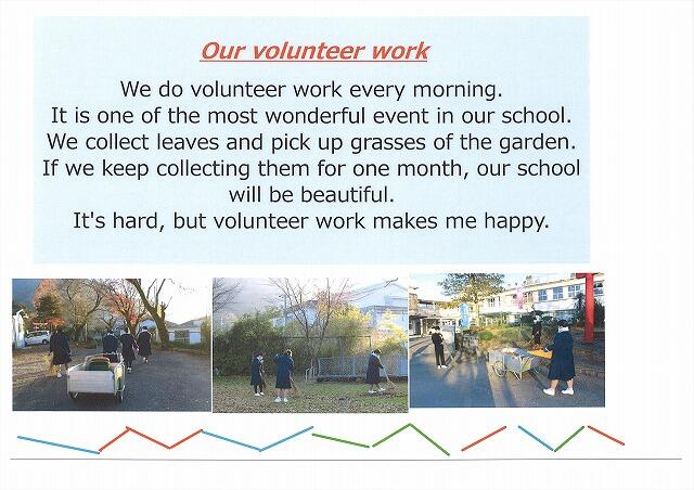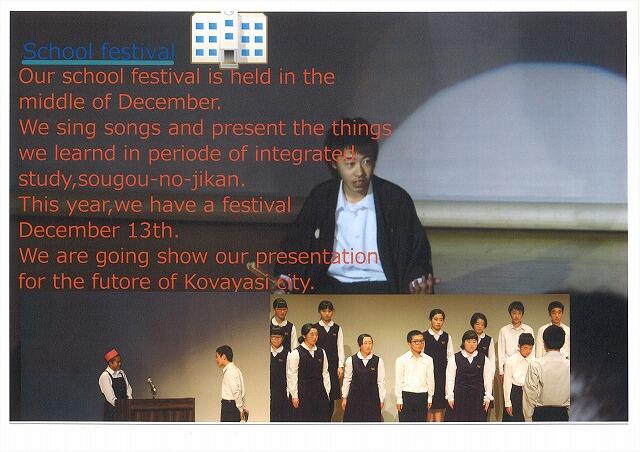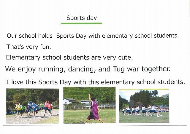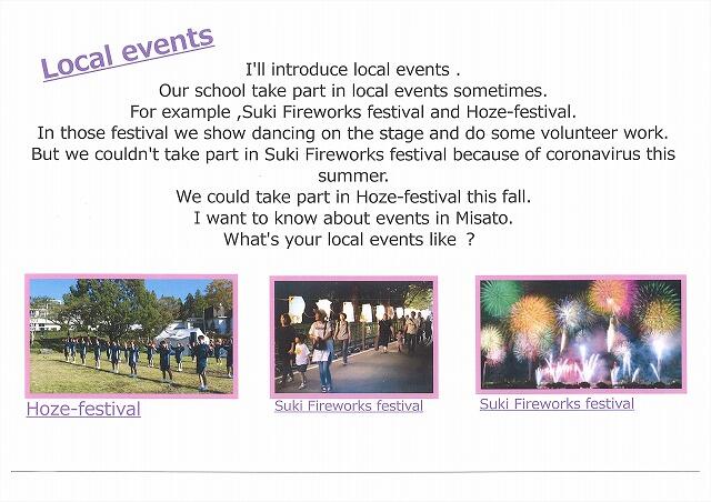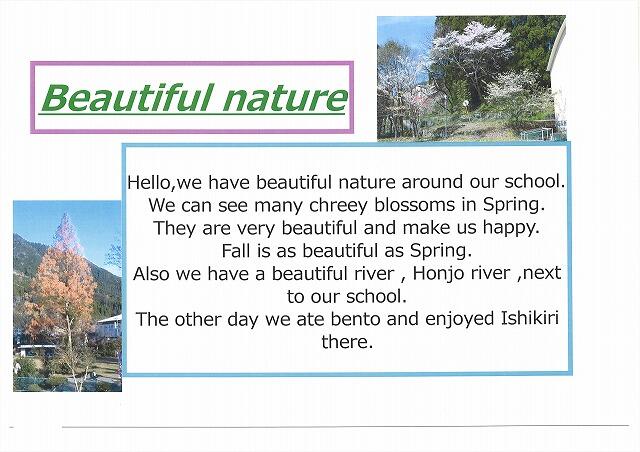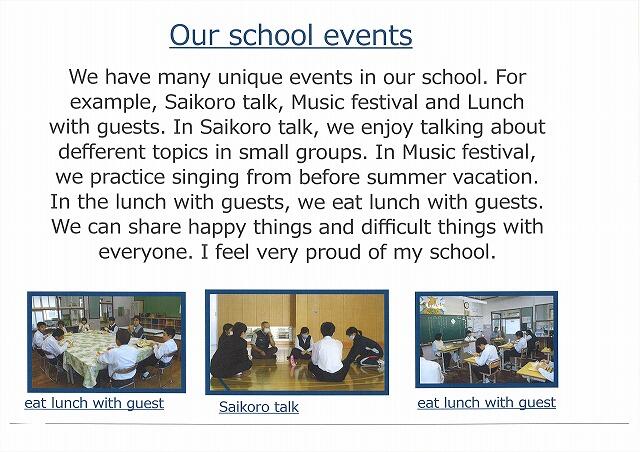 須木中学校の良さを自分なりの視点で探し出し、それぞれが違うテーマで紹介文を作成しています。短い英文ですが、中学校で習った表現を駆使し、まだ習っていない表現も調べながら一生懸命作成しました。12月に、交流のある美郷町立美郷南学園の3年生の生徒のみなさんの前でリモートで発表し、評価をしていただいています。美郷南学園の生徒のみなさん、英語科の須藤先生、その節はお世話になりまして、本当にありがとうございました。