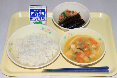 麦ご飯、さつま汁、鰯みぞれ煮、キュウリのスタミナ漬