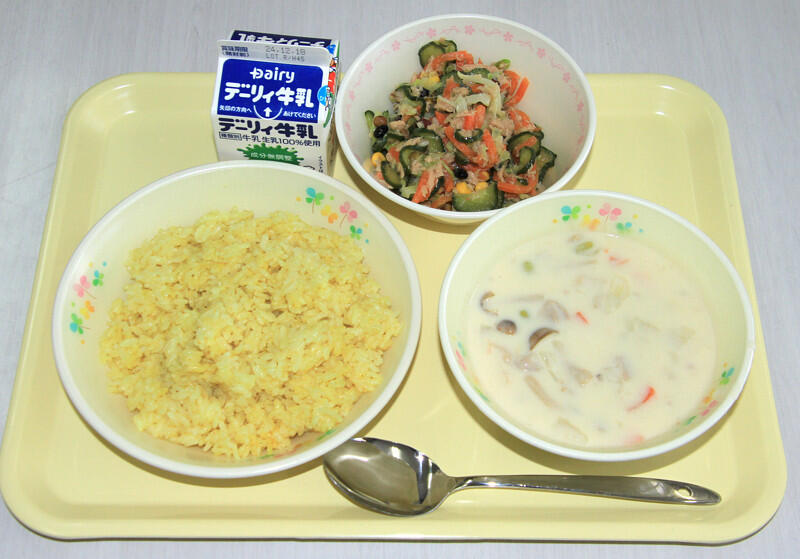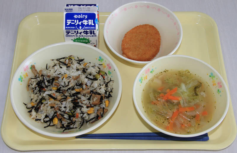 洋風ひじきご飯、コンソメスープ、日向鶏コロッケ