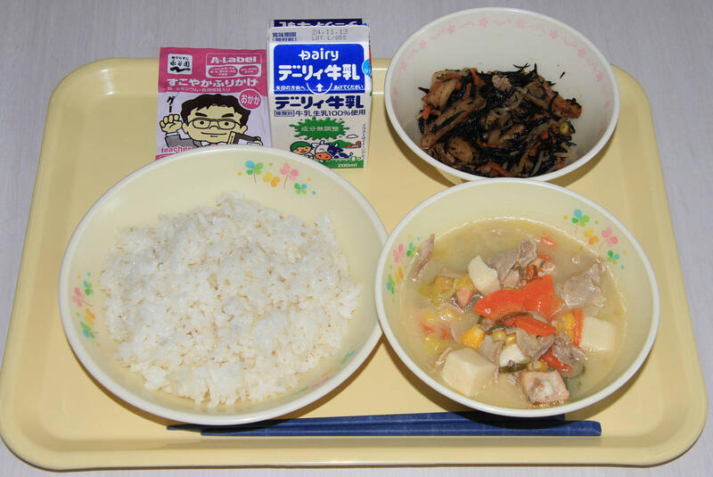 麦ご飯、おかかふりかけ、石狩汁、ひじき炒め