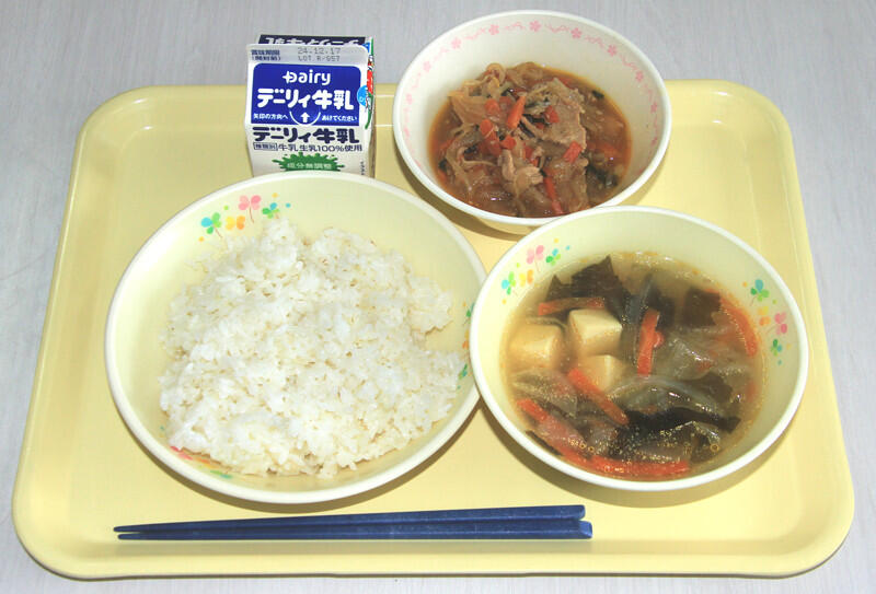 麦ご飯、すき焼き煮、大根の胡麻酢和え