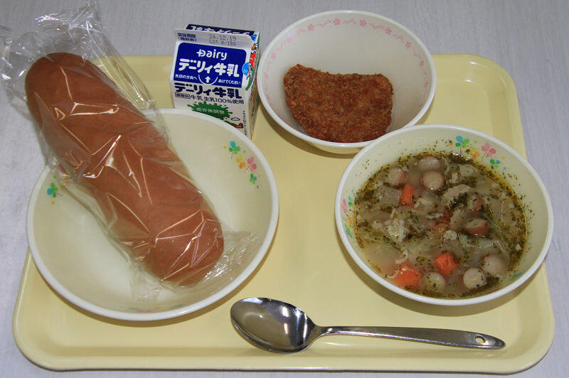 ワカメご飯、オニオンスープ、サーモンチーズフライ