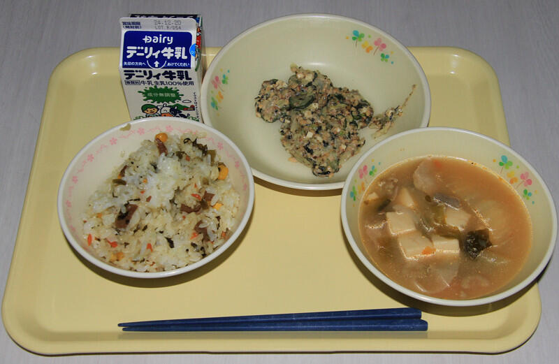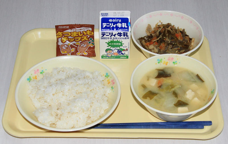 麦ご飯、呉汁、茎わかめのきんぴら、サツマイモチップス