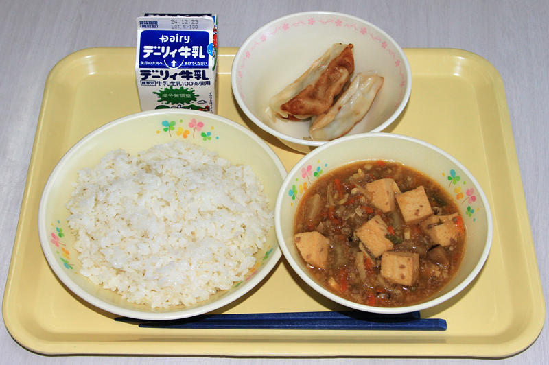 麦ご飯、スープぎょうざ、魚のピリ辛ソース