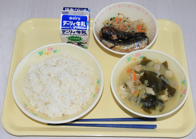 麦ご飯、澄まし汁、秋刀魚おかか煮、もやしとキュウリの胡麻和え