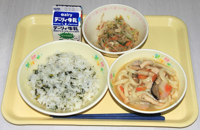 ゆかりご飯、ちゃんこうどん、千切り大根の酢の物
