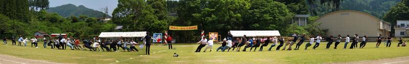 本日は強風の中、8時30分から11時過ぎまで中学校の運動場で小中合同体育を行い、開会式や閉会式、団技(団体競技)、リレー、エール交換、応援練習等を行いました。