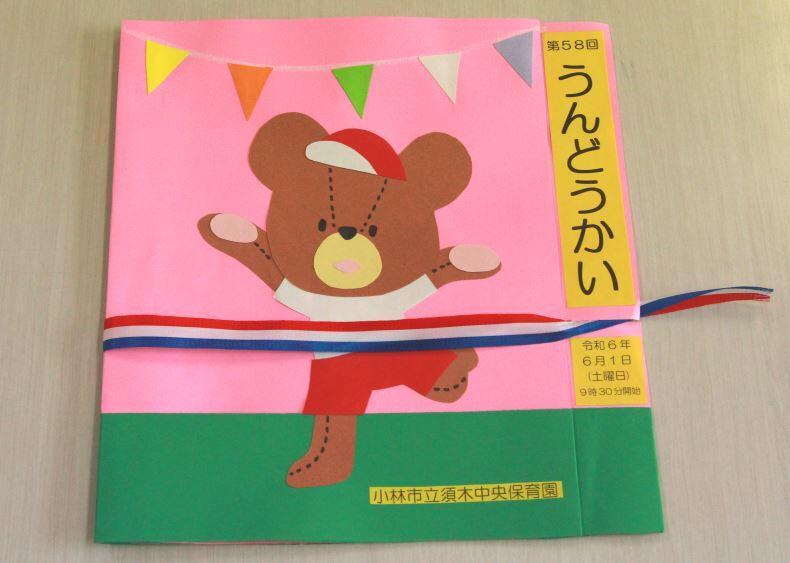 表紙はゴールするクマさんで、ゴールテープが閉じひもになっています。とても可愛らしく、そしてアイデアにあふれたデザインです。