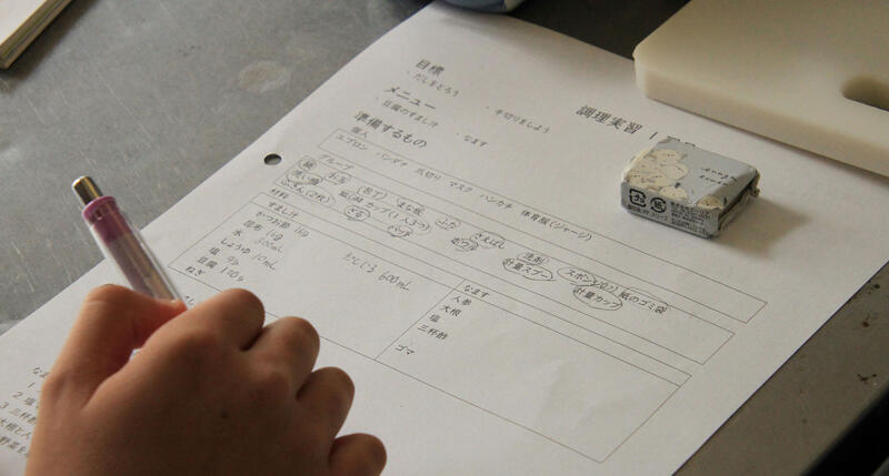 調理実習に向けて、材料の分量を計算したり、準備物を確認したりするなどの計画書づくりに取り組んでいました。