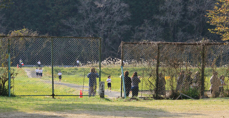 学校の周囲のコースの途中では、保護者の皆様が応援してくださっています。