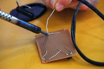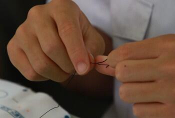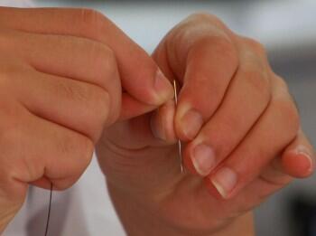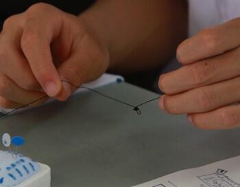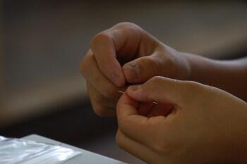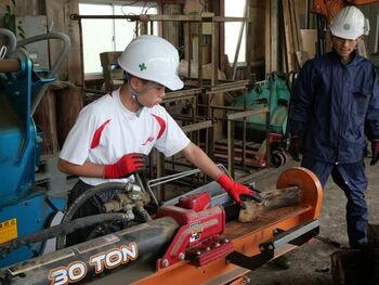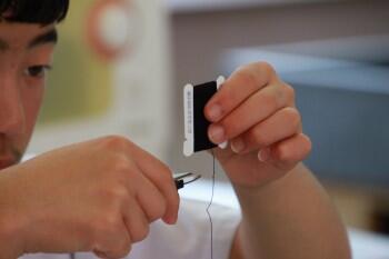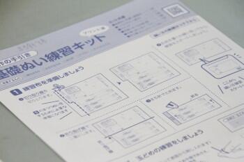 体におもりをつけ、見えにくくするめがねをかけて作業をしています。