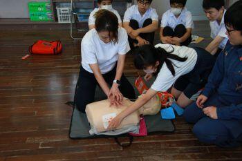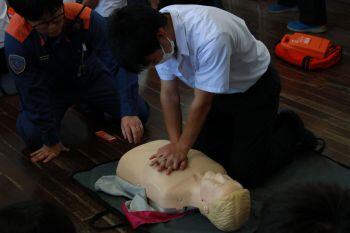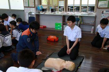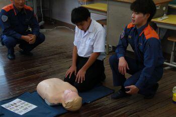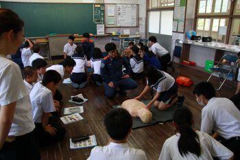 胸部圧迫の方法やAEDの使い方について、全員が実習を行いました。
