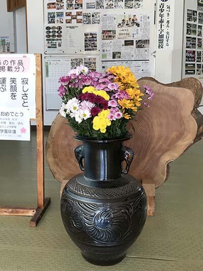 現在、いただいた花を玄関ホールに飾っています。皆様も学校の近くに来られた際にはぜひお立ち寄りください。