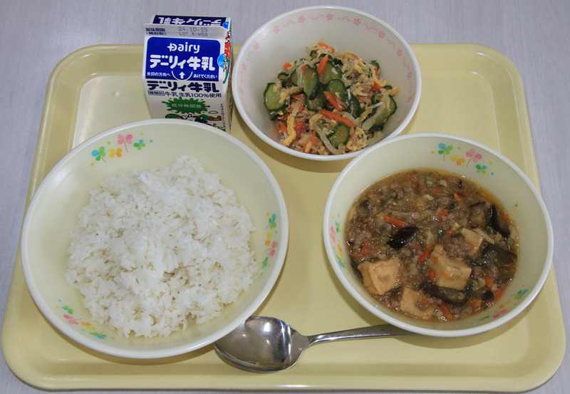 麦ご飯、マーボー茄子、棒々鶏