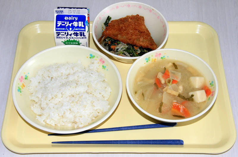 麦ご飯、大根の味噌汁、鯵のチーズフライ、ホウレンソウの胡麻和え