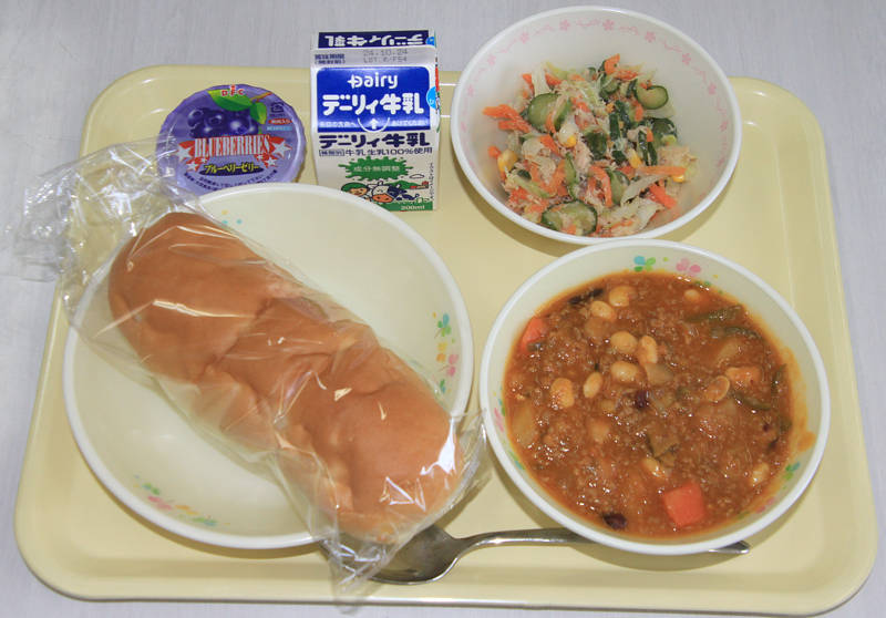アップルパン、野菜と豆のミートソース、ツナサラダ、ブルーベリーゼリー