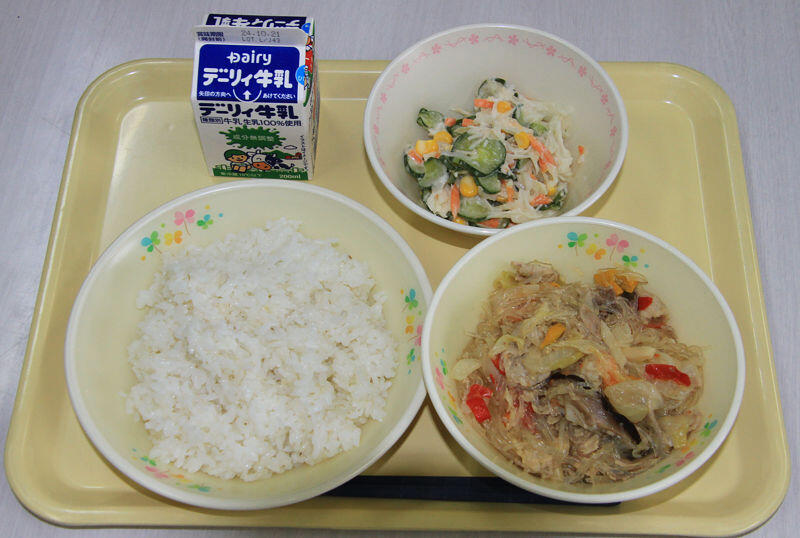 麦ご飯、豚肉と春雨のカラフル炒め、千切り大根のマヨネーズ和え