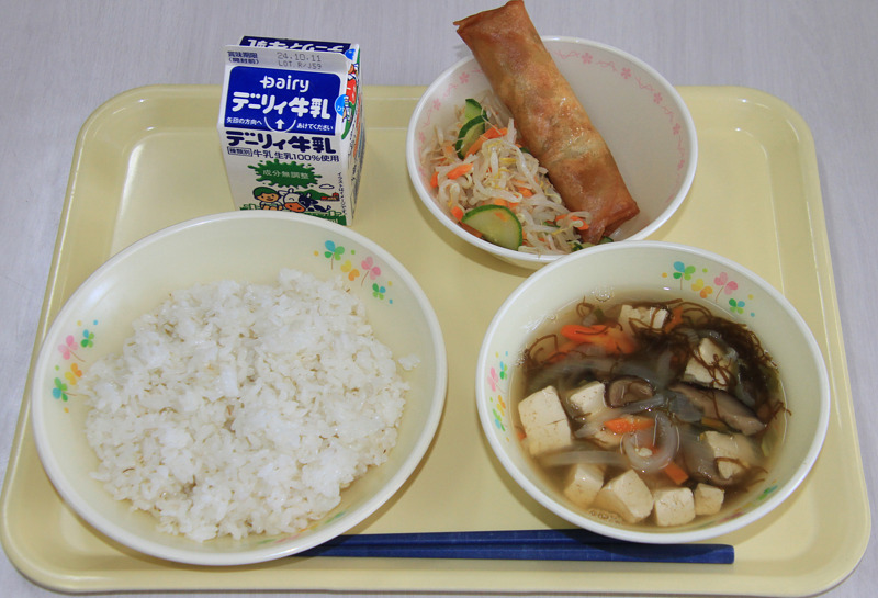 麦ご飯、もずくスープ、中華春巻き、もやしのナムル