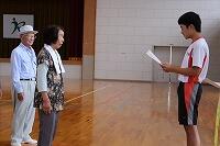 まず、小林市社会福祉協議会会長 種子田與市様のあいさつの後、先月の「すき納涼花火大会」で子どもたちが行った災害ボランティアの益金を、生徒を代表して3年の西道楓佳さんが種子田会長に贈呈しました。