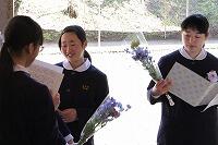 3月30日(火)は、離任式でした。お世話になった5名の先生方が須木中学校を去られることになりました。はじめに今年度ご退職の池山 律子先生に感謝状が贈られ、式では吉村 政文先生、深海 美岐子先生、小田 和彦先生にも生徒より花束が贈られました。先生方も生徒も涙、涙でした。生徒を代表して生徒会長の片地 和奏さんからお別れの言葉が贈られ、式が終わってからも名残惜しそうに先生方と話す多くの生徒の姿が見られました。