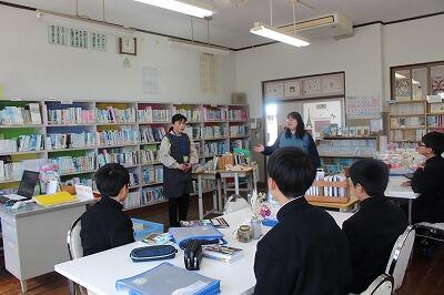 学校図書館協力員の辻本さんと国語の宮原先生に習って、実際に図書の本を借りてみました。