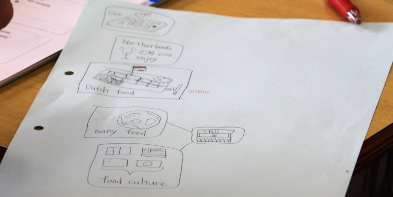 オーラルプレゼンテーションを行い、教科書で読んだ本文の中身を絵でまとめて、それを基に英語で説明する取り組みを行っていました。