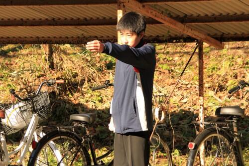 昼休みの時間に、体育館前に係が道具を準備しています。