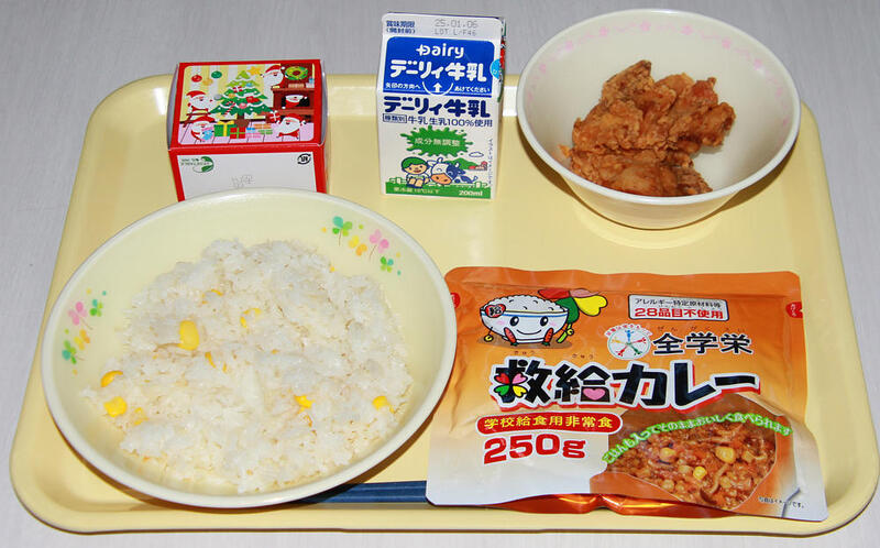 コーンご飯、ABCスープ、救給カレー、鶏の唐揚げ、クリスマスケーキ