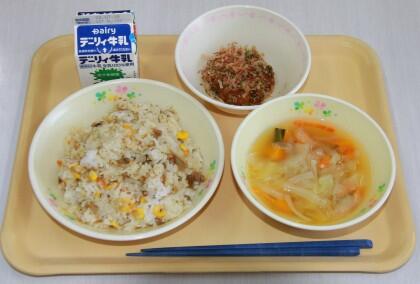 西諸っ子ご飯、カラフル野菜スープ、揚げたこ焼き