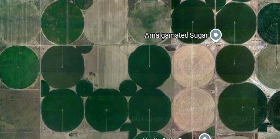 「センター」は中央、「ピボット」は回転軸のことで、植物を育てにくい乾燥した地域で行う灌漑農法のことでした。半径数百mの円形の農地をつくり、その中央に井戸を掘ります。くみ上げた水をそこから円の縁まで伸びた車輪のついた散水パイプが中央を回転軸に移動しながら作物に水を与える灌漑方式です。