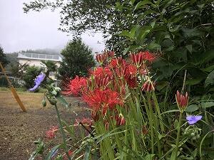 学校周辺の田んぼのまわりや土手に、彼岸花が咲いています。