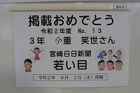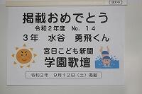 9月12日(土)付の宮日こども新聞に、本校3年生、水谷 勇飛さんの短歌が掲載されました。ようやく涼しくなってきた昨今ですが、夏の暑い日差しを懐かしく思い出させるような、生き生きと躍動感のある作品に仕上がっています。今年は様々な制約があり我慢の夏でしたが、来年はもっとプールでたくさん泳げるようになるといいですね。