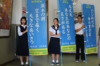 今年度は、のぼり旗を作成することになり、10月7日に本日校長室にて、報道関係の方々もお呼びしてそのお披露目会を行いました。最優秀賞に本校3年生の黒木 里海さんの「須木の朝 空まで届く 大きなあいさつ」が選ばれ、正門にのぼり旗が掲示されました。優秀賞に3年生の栗原 光くんと2年生の西道 桃佳さんの作品も選ばれ、須木地区体育館と須木総合ふるさとセンターに掲示されました。