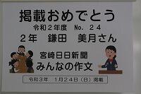 1月24日付の宮崎日日新聞の「みんなの作文」のコーナーに、2年生の鎌田 美月さんの作文が掲載されました。3年生の先輩の姿に憧れ、自分も全校生活保体委員長として健気に頑張ろうという決意が書かれています。