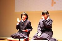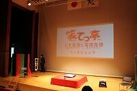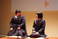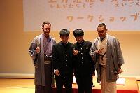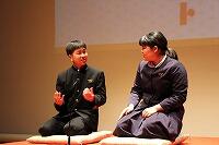 はじめに、冬休み中に練習した英語落語をペアで6組の生徒が披露し、桂 かい枝様と英語科の中山先生が審査をしてくださいました。どのペアも伸び伸びとした表情で落語を披露し、会場の笑いを誘っていました。優勝は、3年の齋藤 恭吾くんと前田 理稀くんのペアで、講師の方々と記念撮影を行いました。