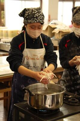 午前中の家庭科の授業で、3年生が肉うどんとチョコマカロンを作る調理実習を行いました。