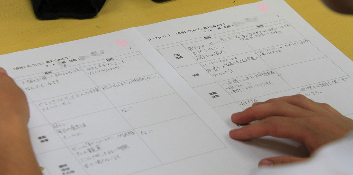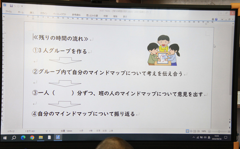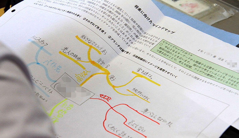 今週金曜日の農業体験学習のしおりの確認を行い、そのあと、それぞれ作成した「将来に向けたマインドマップ」をもとに、グループで説明を行いました。