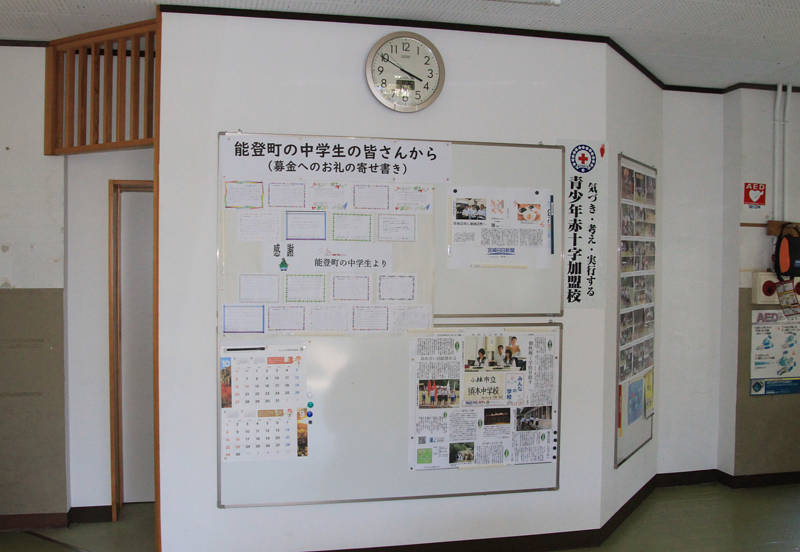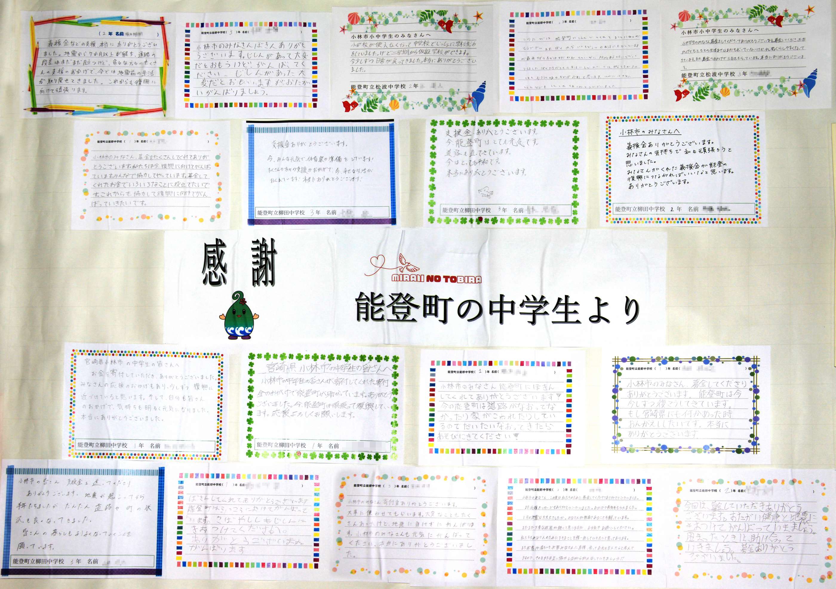 この度、その能登町の中学生の皆さんから学校宛に、お礼の寄せ書きをいただきました。
