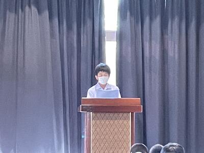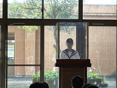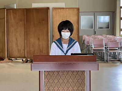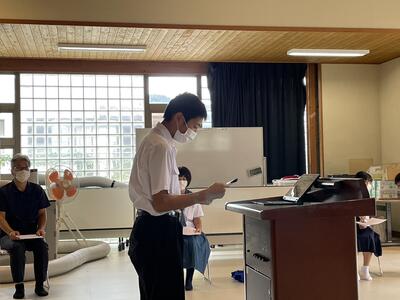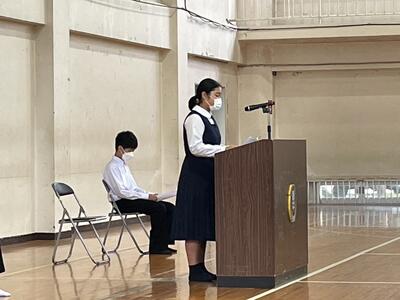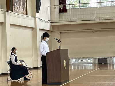 集会では、各学年の代表者・生徒会役員の代表からの「1学期前期の反省発表」がありました。