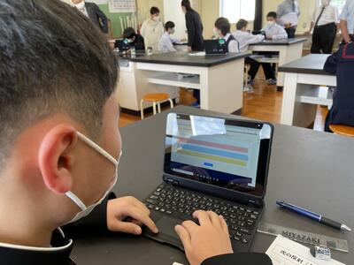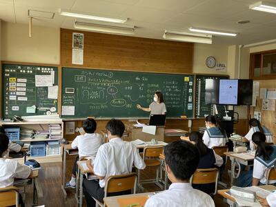 「出前授業」と言っても、3年生の生徒が飯野高校へ行かせていただき、涼しい教室の中で、気持ちよく実習をさせていただきました。