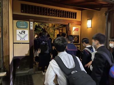 修学旅行1日目のスケジュールがやっと終わり、路面電車で広島駅に向かい、預けていた荷物を取って、新幹線で「のぞみ116号」で京都駅へ。疲れて寝ている生徒、気分が高まっている生徒、と様々でした。あっという間に京都駅に着き、バスで宿泊先の旅館「三賀」へ。提灯でお迎えいただき、宿について、おいしい夕食をいただきました。