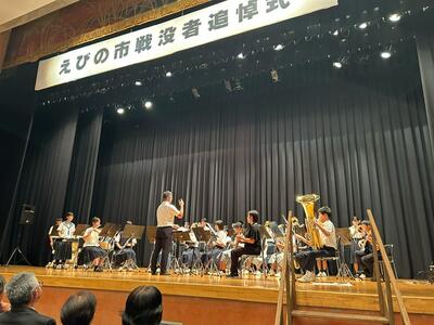 また、式典後に行われたアトラクションでは、飯野高校・飯野中学校・加久藤中学校合同吹奏楽部が、「フロンティアスピリット」「沖縄ソングコレクション」「日本愛唱歌アルバム」を演奏してくれました。沖縄ソングコレクションでは、「平和への願い」が込められた曲が数多く取り上げてあり、会場に参列されていた方々の中には、うなずきながら聴き入っている姿が見られました。ご協力いただいた皆様、ありがとうございました。