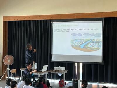 6日(金)の午後、飯野中近くの川内川において防災・減災に向けて作業を進めている建設業者(緒方組やコマツ宮崎 等)のお話を1年生が聞く機会をいただきました。川内川は大雨が降ると氾濫することもありますが、1年生は、地域の中において、災害を未然に防ぐための作業が、日常的に行われていることを学ぶことができました。
